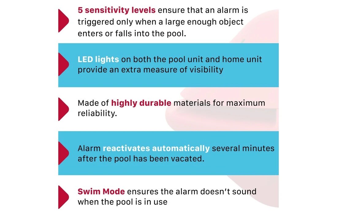 - Het produceert een krachtig, luid alarm op zowel de zwembadunit als op het home-systeem.
